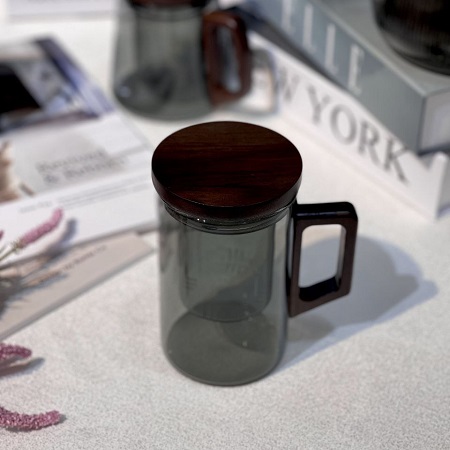 ماگ دمنوش پیرکس درب بامبو دسته چوبی رنگ دودی